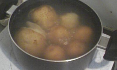 茹でたジャガイモの皮をとって、潰します